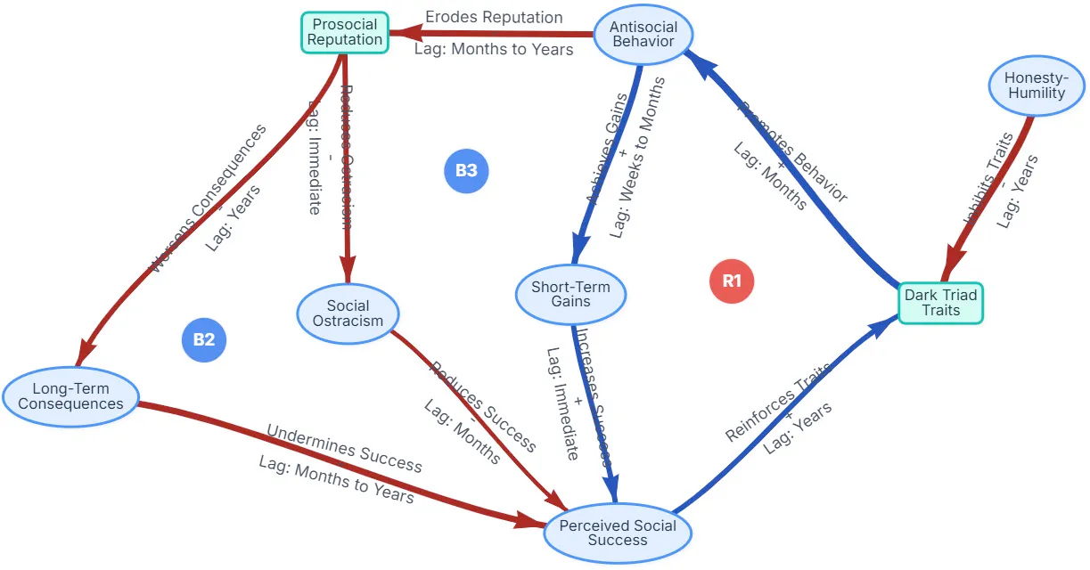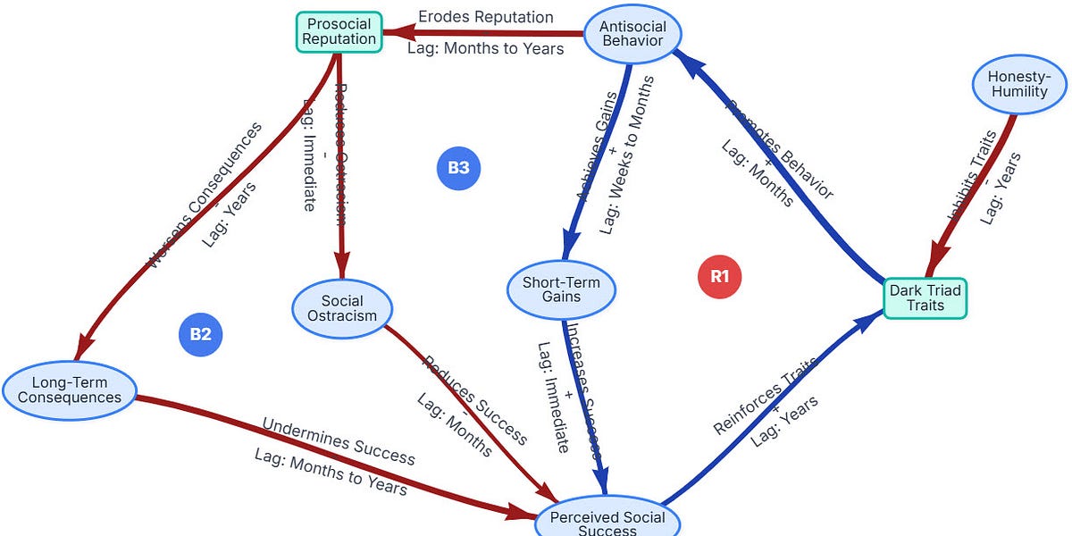 Since that time I’ve explored personality, and the conceptualization of dark personalities, across many fields, including psychology, social and political science, behavioral economics, cognitive neuroscience, cultural anthropology, and game theory. After years of researching how dark personalities evolved, what behaviors they exhibit, which environments they thrive in, and how various cultures have dealt with them, I’ve come to a somewhat startling conclusion. I believe the common thread tying together every component of the polycrisis humans face today — from environmental collapse, to political instability, to wealth inequality — is the success of sociopaths and their values in the absence of adequate social controls.